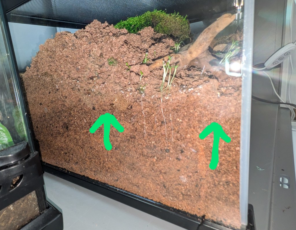In this Aphonopelma seemanni enclosure, you can clearly see the moisture line in the substrate where I have maintained slightly moist sublayers, and dry surface layers.